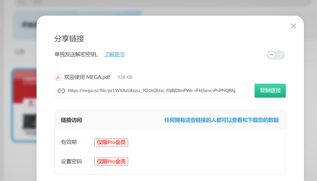 共享下载链接 – 您可以创建一个指向存储空间中任何文件夹或文件的链接。您可以创建两种不同的链接–锁定或解锁。如果你想保持数据的私密性,只与特定的人共享,你可以向他们发送包含加密密钥的封闭链接。您也可以发送不含加密密钥的锁定链接。这尤其适用于将链接公开的情况。之后,你只需将加密密钥交给需要的人即可。这种共享文件的方式在大学和学院就很常见。您还可以共享解锁链接–任何人都可以访问文件。